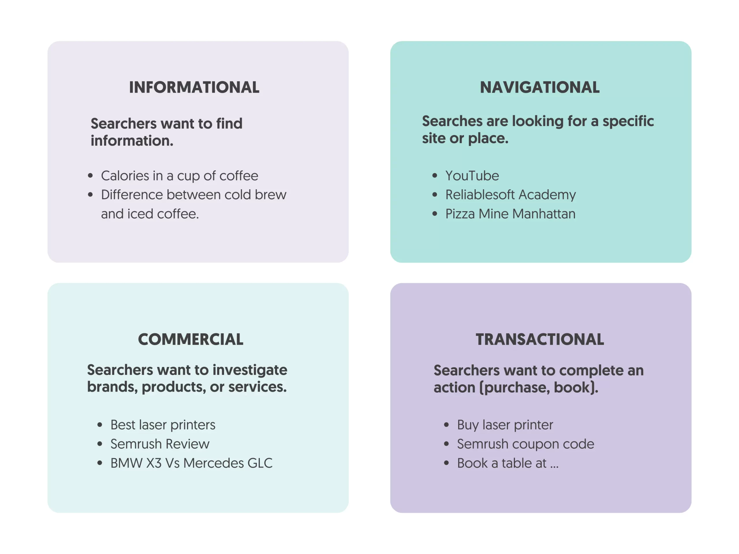 - Commercial (e.g., “best laser printers”)